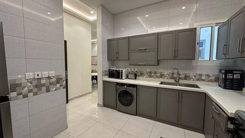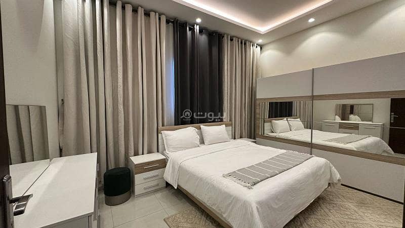شقة مفروشة بالكامل في الرياض، حي العليا تتكون من غرفتي نوم (1 ماستر)، غرفة معيشة، 3 حمامات، مطبخ مجهز بالكامل، ومكتب