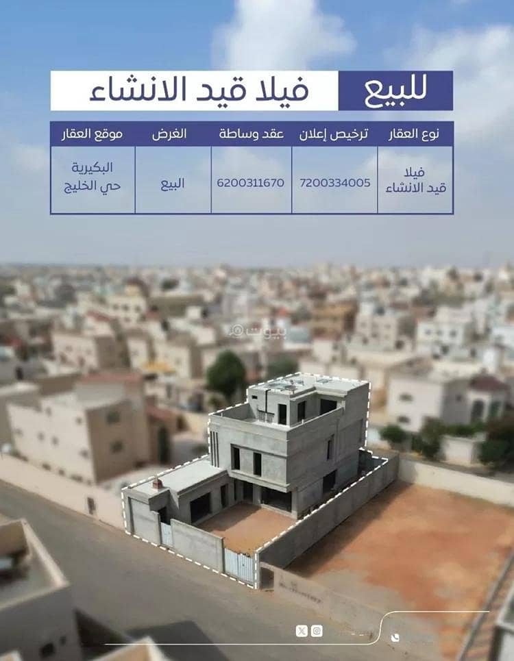 للبيـــــع فيلا قيد الإنشاءالموقع: البكيرية (حي الخليج)