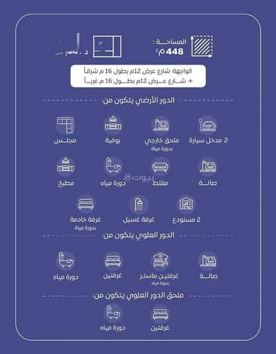 الواجهة: شارع عرض 12م بطول 16م شرقًا + شارع عرض 12م بطول 16م غربًا
