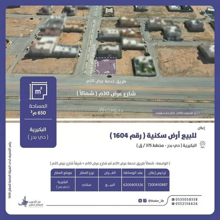 للبيــــع أرض سكنية (رقم 1604)المــــــوقع: البكيرية (حي بدر - مخطط 375/ق)---------------------------------------------------المســـاحة: 650م²الواجهـــــة: طريق خدمة عرض 20م ثم شارع عرض 30م (شمالًا) + شارع عرض 25م (شرقًأ)---------------------------------------------------رقم ترخيص الإعلان: 7200430887رقم عقد الوســاطة: 6200405326