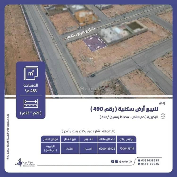 للبيع أرض سكنة ( رقم 490 )الموقع : البكيرية ( حي الأمل - مخطط رقم 230 / ق )