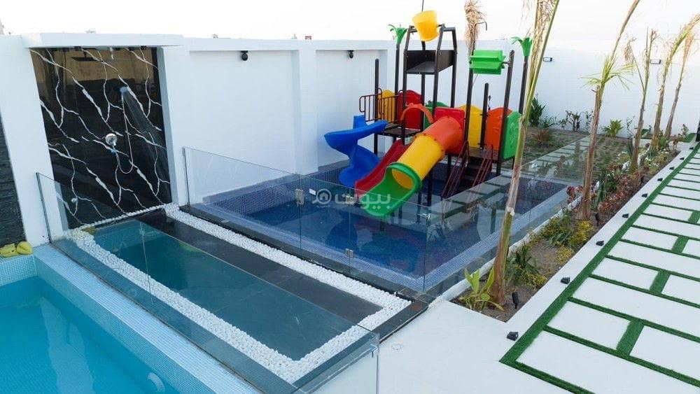 غرفتين نوم، صالة كبيرة، مطبخ داخلي متكامل ودورتين مياه داخلية، دورة مياه خارجية، مسبح للكبار، مسبح خاص بالأطفال مجهز بألعاب مائية، جلسات إستجمام وتشميس خارجية، جاكوزي لشخصين