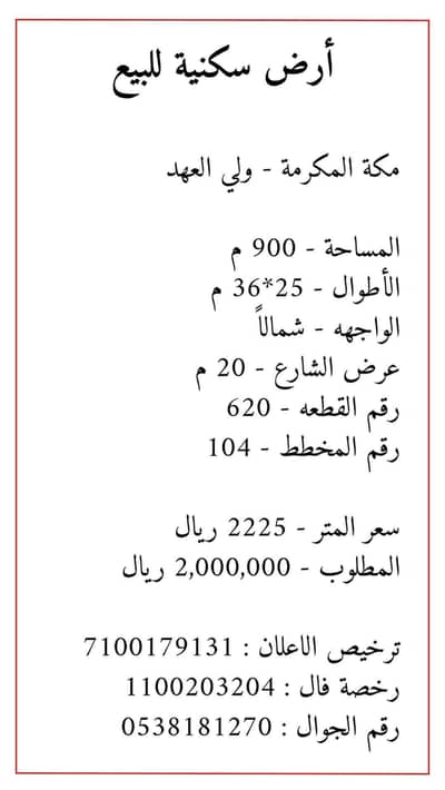 للاستفسارات أو لتحديد موعد زيارة، يرجى عدم التردد في الاتصال بنا. الطلب على الأراضي السكنية في مكة في تزايد مستمر، لذا تصرف سريعًا لتأمين هذه الفرصة.