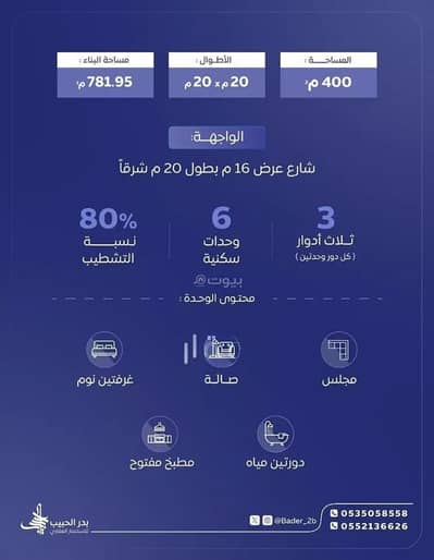 الـــواجهة: شارع عرض 16م بطول 20م شرقاً----------------------------------------------------ثلاث أدوار ( كل دور وحدتين ) | 6 وحدات سكنية | 80 % نسبة التشطيب