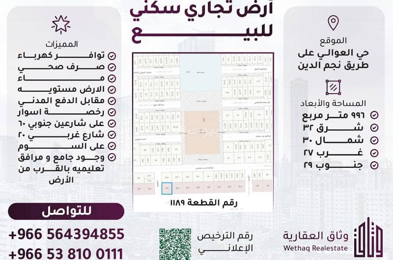 أرض تجاري سكني زاوية حي العوالي على طريق نجم الدين