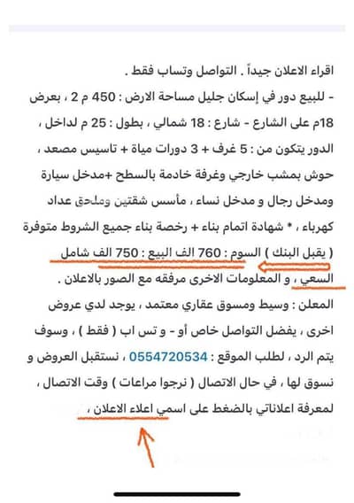 للبيع دور في إسكان جليل مساحة الارض : 450 م 2 ، بعرض 18م على الشارع - شارع : 18 شمالي ، بطول : 25 م لداخل ، الدور يتكون من : 5 غرف + 3 دورات مياة + تاسيس مصعد ، حوش بمشب خارجي وغرفة خادمة بالسطح +مدخل سيارة ومدخل رجال و مدخل نساء ، مأسس شقتين وملحق عداد كهرباء ، * شهادة اتمام بناء + رخصة بناء جميع السروط متوفرة ( يقبل البنك ) السوم : 760 الف صافي الحد : 750 الف شامل السعي ، قابل للتفاوض حد المعقول