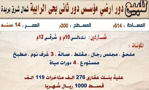 اكتشف فرصة استثنائية للاستثمار في طابق يقع في منطقة الرباية المرغوبة، بريدة في منطقة القصيم. تعتبر هذه العقار مثاليًا لأي شخص يتطلع إلى إقامة مسكن أو استثمار في هذه المدينة النابضة بالحياة.