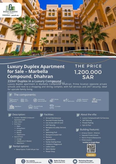 شقة دوبلكس للبيع في كمباوند ماربيا, الظهران بمساحة 233 متر مربع