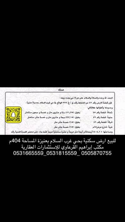للبيع ارض في حي غرب السلام بعنيزة