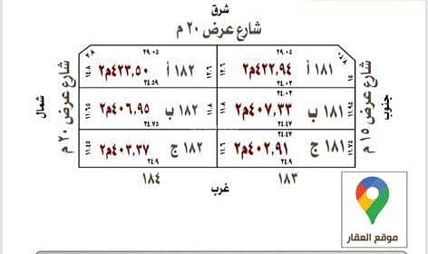القطعه رقم 182ج مساحة : 403.37م تفتح علي شارع عرض 20م شملأ بطول 11.45م