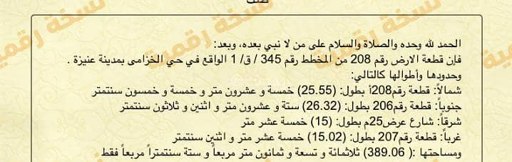 *قطعة رقم 208 مساحة (389.06)م تفتح على شارع عرض 25م بطول 15م شرقاً