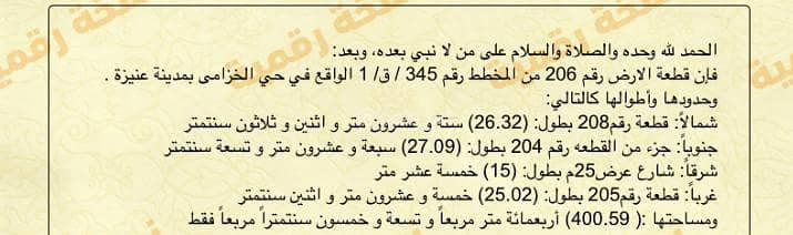 *قطعة رقم 206 مساحة (400.59)م تفتح على شارع عرض 25م بطول 15م شرقاً
