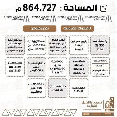 . الغرض : بيع مزرعة قائمة. مخطط : عيون الجواء. مساحة : 864.727 م. جنوباً طريق الملك خالد عرض 50م بطول 1060م. شمالاً شارع عرض 50م بطول 1245م. غرباً شارع عرض 50م بطول 971م