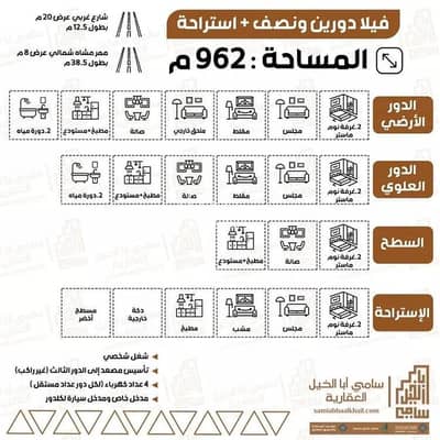 . الغرض : بيع فيلا دورين ونصف+إستراحة. مخطط : 29/ق. مساحة : 962.5 م. الرهن : 300.000 للصندوق. غرباً شارع عرض 20 م بطول 12.5 م. شمالاً ممر مشاه عرض 8 م بطول 38.5 م
