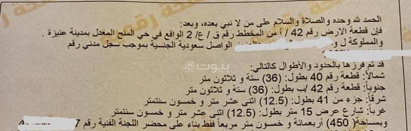 يتم جلب الموقع والتحقق منه بواسطة الهيئة العامة للعقاروصف موقع العقار حسب الصك:حي المنح المعدل بمدينة عنيزة .