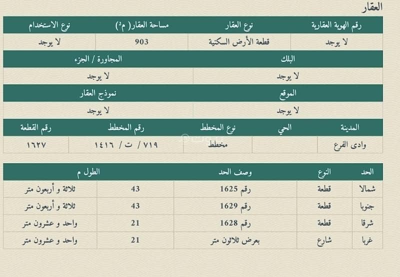 يتم جلب الموقع والتحقق منه بواسطة الهيئة العامة للعقاروصف موقع العقار حسب الصك:قطعة الأرض السكنية رقم ( 1627 ) الواقعة فى مخطط ريع ملح السكنى من المخطط رقم 719 / ت/ 1416 بمحافظة وادى الفرع .