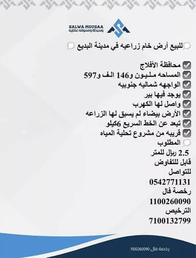 للبيع أرض خام زراعيه في مدينة البديع محافظة الأفلاج المساحه مـلـيـون و146 الـف و597 الواجهه شماليه جنوبيه يوجد فيها بير واصل لها الكهرب الأرض بيضاء لم يسبق لها الزراعه تبعد عن الخط السريع 6كيلو قريبه من مشروع تحلية المياه المطلوب2.5 للمترقابل للتفاوضللتواصل0542771131رخصة فال1100260090الترخيص7100132799