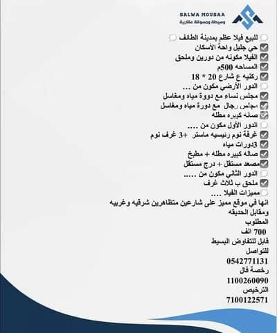 للبيع فيلا عظم بمدينة الطائف حي جليل واحة الأسكان الفيلا مكونه من دورين وملحق المساحه 500م ركنيه ع شارع 20 * 18 الدور الأرضي مكون من … مجلس نساء مع دووة مياه ومغاسل مجلس رجال مع دورة مياه ومغاسل صاله كبيره مطله الدور الأول مكون من …. غرفة نوم رئيسيه ماستر +3 غرف نوم 3دورات مياه صاله كبيره مطله + مطبخ مصعد مستقل + درج مستقل الدور الثاني مكون من …. . ملحق ب ثلاث غرف مميزات الفيلا …. انها في موقع مميز على شارعين متظاهرين شرقيه