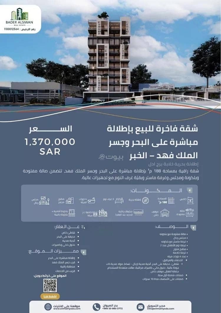 المميزات:• إطلالة بحرية خلابة على البحر وجسر الملك فهد• موقع استراتيجي قريب من الخدمات والمراكز الحيوية• تصميم راقٍ وتشطيبات حديثة عالية الجودة• إدارة وصيانة احترافية• بالقرب من الفنادق والكافيهات والمطاعم الراقية