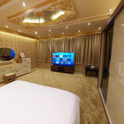 مكونه من غرفة نوم رئيسية بسرير مزوج و خزانة ملابس وتسريحة كم تحتوي على شاشه سمارت ٦٥ بوصه وسجاد واضاءات حسب رغبتك مع زجاج مطل على شارع رئيسي وحيوي.