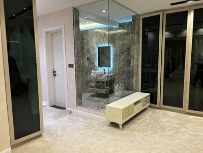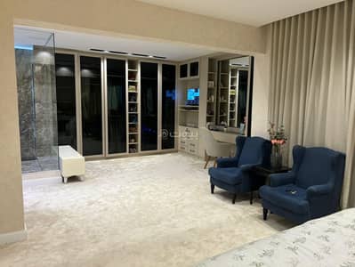 غرفة نوم مع غرفة ملابس ودورة مياه وجلسة زجاجية خارجية –