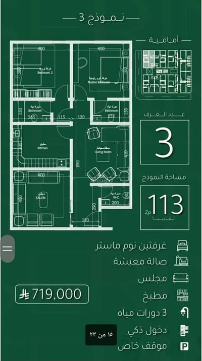 غرفتين مساحه 101م بسعر 639 الف كاش3 غرف اماميه مساحه 113بسعر 719 الف3 غرف ذاخليه بسعر113م بسعر 689 الفالاستفسار0595012086