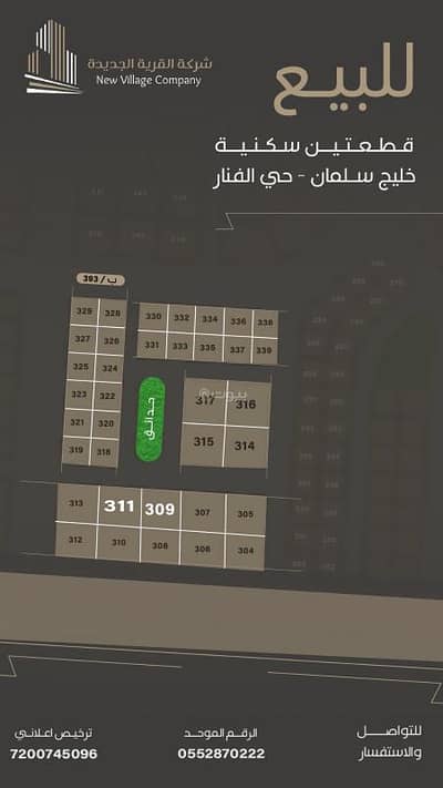 قطعتان رقم 309 و311 في حي الفنار، خلف شارع تجاري رئيسي، ومجاورة لأهم المشاريع الجديدة في خليج سلمان.