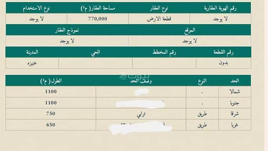 طريق المدينة المنورة بعنيزه بمساحه اجمالية 770,000 م جنوبية غربية شارع عرض40متر الملاحظات / يوجد اختلاف بالمساحة حسب الصك: 770,000متر وبالطبيعة: 702,994.74 متر للنزع لصالح الطريق
