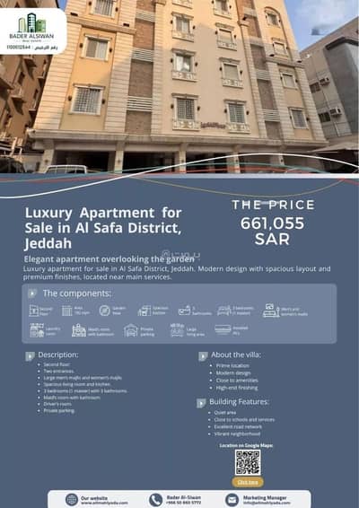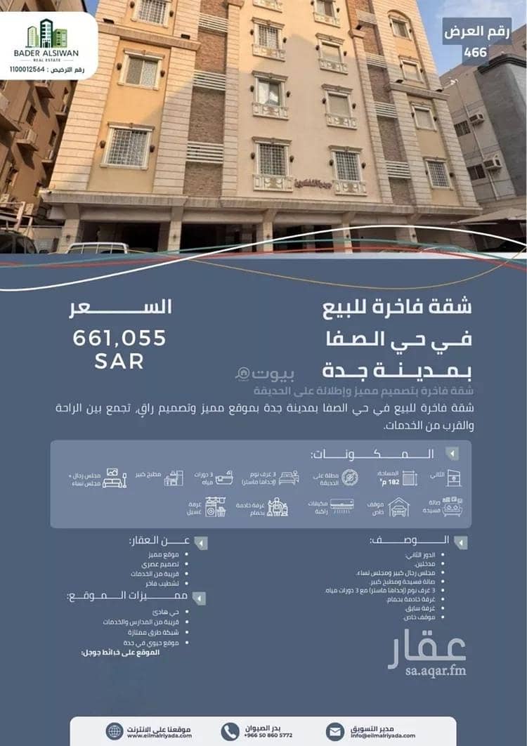 المميزات:• موقع حيوي في قلب حي الصفا• تشطيب فاخر وإطلالة جميلة• قرب من المدارس والخدمات• جاهزة للسكن الفوري