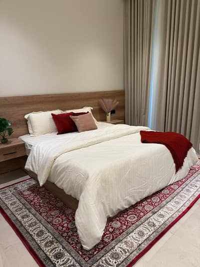 شقة جديدة مؤثثة بالكامل اثاث فاخر بدخول ذكي مكونة من غرفتين ماستر وصالة واسعة مفتوحة على المطبخ وطاولة طعام مع حمام اضافي ثالث.
