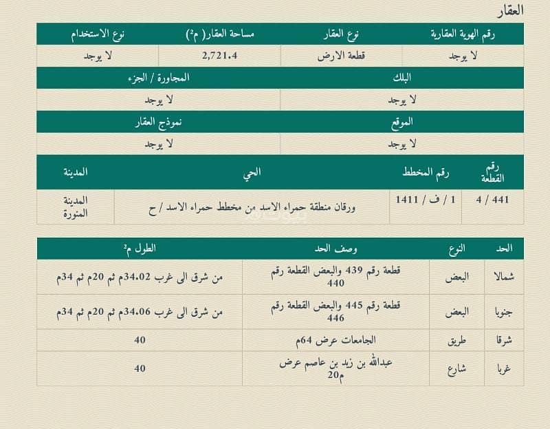 يتم جلب الموقع والتحقق منه بواسطة الهيئة العامة للعقاروصف موقع العقار حسب الصك:حي ورقان منطقة حمراء الاسد من مخطط حمراء الاسد / ح بمدينة المدينة المنورة .