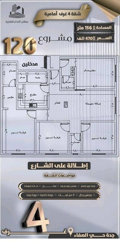شقه 4 غرف امامية مساحة 156م السعر 470 الف كاش حي الصفا