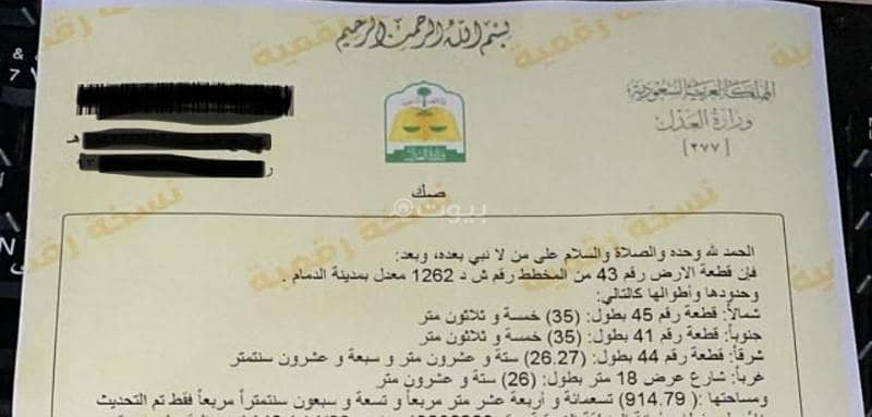 يتم جلب الموقع والتحقق منه بواسطة الهيئة العامة للعقاروصف موقع العقار حسب الصك:قطعة الارض رقم 43 من المخطط رقم ش د 1262 معدل بمدينة الدمام .