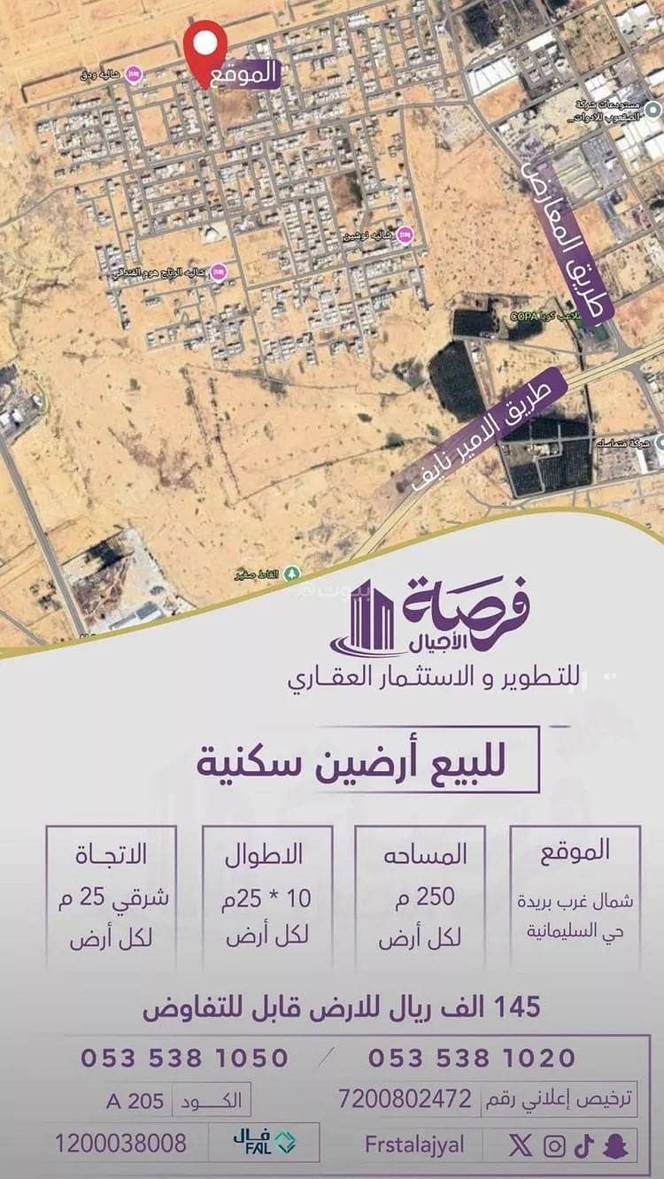 ارضين سكنية للبيعالموقع :شمال غرب بريدة - حي السليمانيةالمساحة : 250 م للارضالاتجاة : شرقي 25 مالاطوال : 10 م * 25 مالسعر : 145000 للارض قابل للتفاوض