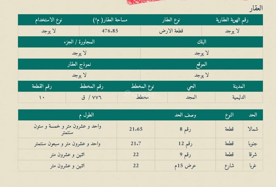 - الحد الشرقي: 22 متر (قطعة رقم 9)