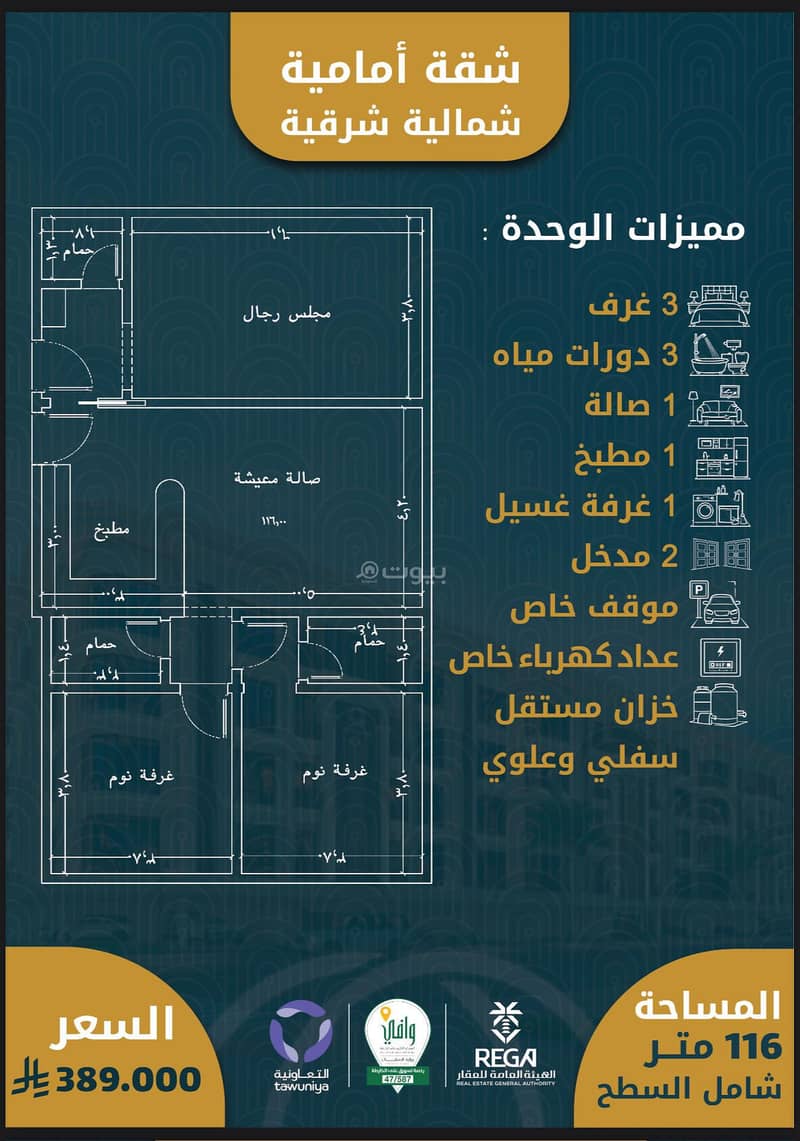 ٣غرف اماميه شماليه مساحه ١١٤م بسعر ٣٨٩ الف