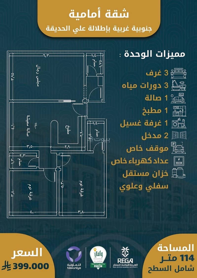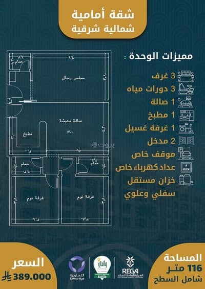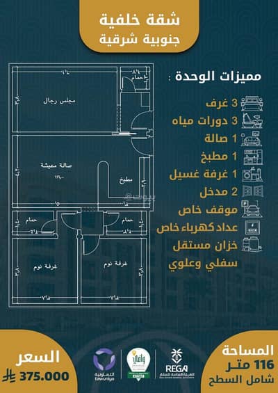 ٣غرف أماميه مساحه ١١٦م بسعر ٣٨٥ الف فقط