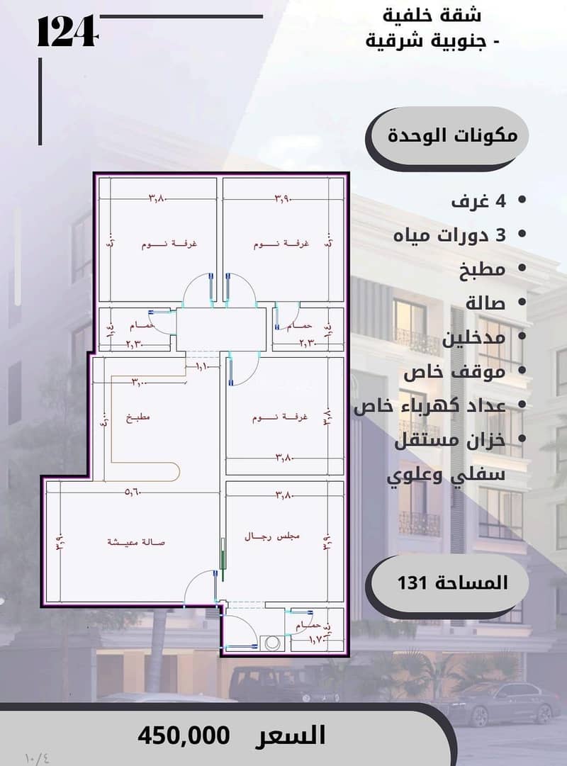 هذه الشقة ليست مجرد ملكية؛ إنها فرصة لبناء مستقبل في مجتمع مرحب. مع موقعها الاستراتيجي، ستستفيد من الوصول السهل إلى المرافق المحلية والمدارس وروابط النقل. بالإضافة إلى ذلك، فإن سعر 450,000 ريال سعودي تنافسي للمنطقة، مما يجعل هذا استثمارًا حكيمًا لمشتري المنازل والمستثمرين على حد سواء.
