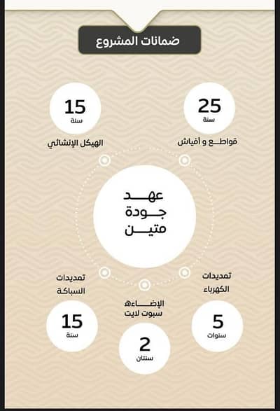 *قواطع وأفياش*: ضمان لمدة 25 سنة. . *الهيكل الإنشائي*: ضمان لمدة 15 سنة.