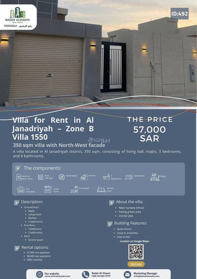 فيلا مميزة بمساحة 350 م²، واجهة شمالية غربية، تصميم عملي وموقع هادئ.