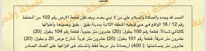 يتم جلب الموقع والتحقق منه بواسطة الهيئة العامة للعقاروصف موقع العقار حسب الصك:حي قرطبه المنطقه الثانية بمدينة بقيق . بقيق