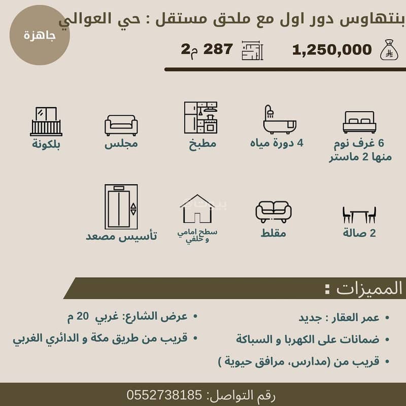 - 6 غرف نوم ( منها غرفتين ماستر)