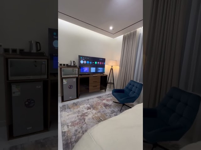 - إستديو مؤثث تأثيث فندقي فاخر، مع حمام خاص وسرير ملكي ودواليب بإضاءة ديكورية. يوجد أيضًا تسريحة وكرسي للراحة، تلفزيون 65 بوصة، ميني بار، ثلاجة، غلاية، وكل التجهيزات اللازمة.