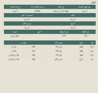 يتم جلب الموقع والتحقق منه بواسطة الهيئة العامة للعقاروصف موقع العقار حسب الصك:قطعة الارض الزراعية رقم 193 من المخطط رقم 519 بمدينة الجلة وتبراك .