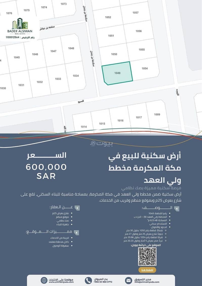 يتم جلب الموقع والتحقق منه بواسطة الهيئة العامة للعقاروصف موقع العقار حسب الصك:قطعة الارض رقم 1049 من المخطط رقم 1 / 7/ 119/ ب الواقع فى مخطط ولى العهد 9 جزء ب بمدينة مكة المكرمة .