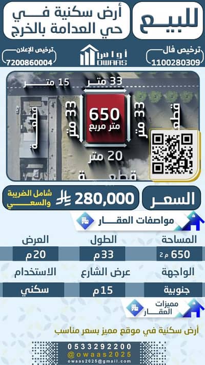 للبيع — ارض سكنية للبيع في حي العدامة بالخرج