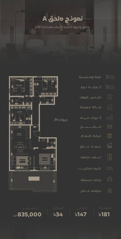 المساحة الكلية: 181 م² (المباني 147 م² + السطح 34 م²).