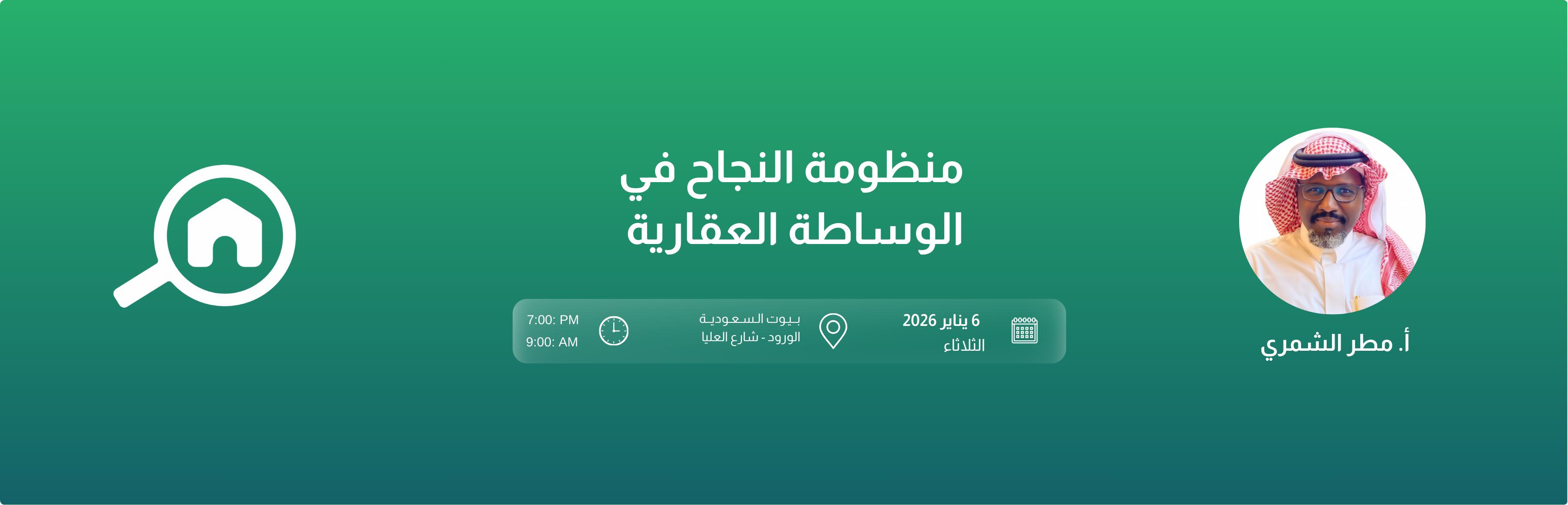 - تتناول هذه الورشة الجوانب الأساسية لتحقيق النجاح في مجال الوساطة العقارية، من خلال استعراض الاستراتيجيات العملية والمعايير المهنية والرؤى التي تساعد الوسطاء على التميز في سوق تنافسي. سواء كنت في بداية مسيرتك المهنية أو تطمح لتطوير مهاراتك، ستمنحك هذه الجلسة الأدوات والتوجهات اللازمة للنجاح المستدام في قطاع العقار.