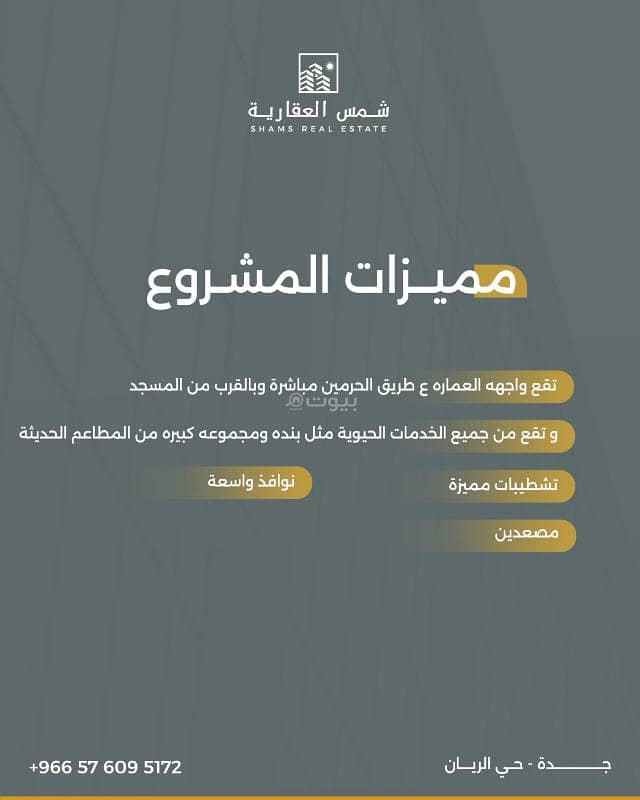(Price cash only or without bank financing support) Al Rayyan 3 rooms hall kitchen 3 bathrooms Two entrances Private parking Separate lower and upper tank Area: 107 m (cash only or without bank financing support) The apartments are distinguished by their great location near the mosque and all services. They are characterized by luxurious and modern finishing based on luxury and quality in designs.