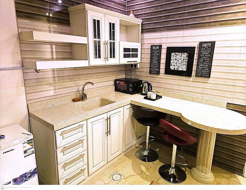 A special quiet place characterized by being completely private from the first entry through the external door. The place is equipped with everything you need to spend a night or more. The studio consists of a seating area that can accommodate six people, as well as another seating area for two people with a double bed and a dining table for six people, an American style kitchen, a bathroom, in addition to a private entrance and an external wall that can be exited.